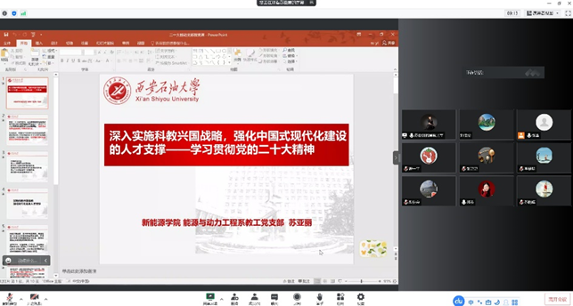 11月10日下午,新能源科学与工程系教工党支部在雁塔校区1教501室开展了党的二十大精神专题学习会,支部全体教师参加会议,会议由党支部书记王洋主持。会上,王洋向与会教师党员传达了学院关于此次专题学习的相关文件通知、要求与部署,介绍了此次集中学习的目的和内容安排,并强调支部全体教师要把学习宣传贯彻党的二十大精神作为当前和今后一个时期的首要政治任务。会上,全体党员依次领学了二十大报告和《中国共产党章程》,并就报告中关于教育事业的论述进行了重点讨论。大家纷纷表示,党的二十大报告将“实施科教兴国战略,强化现代化建设人才支撑”专章论述,凸显了教育在现代化建设中的基础性、战略性地位,全体教师将以更强的责任感、使命感贯彻落实好党的二十大精神,把党的二十大精神转化为指导实践、推动工作的强大动力。