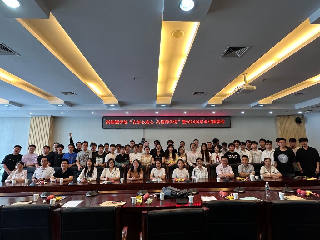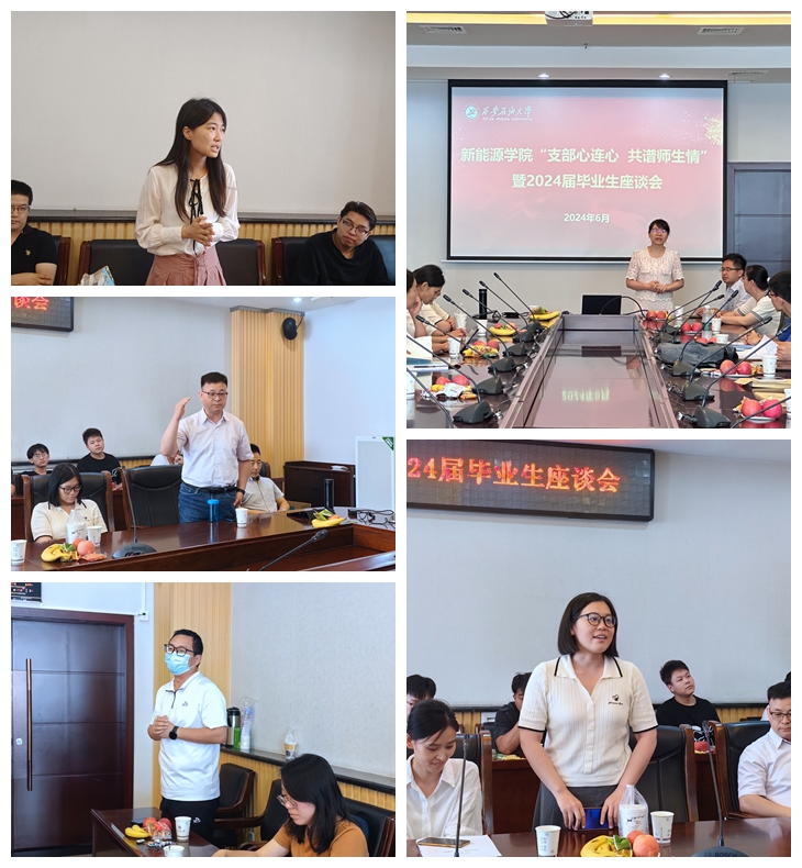 座谈会上,老师们对同学们大学四年中取得的成绩表示祝贺,对大家展现出的良好班风、学风进行了肯定,为即将开启人生新征程的毕业学子送上诚挚祝福并寄予美好期望。临别之际,各班主任不忘送上殷殷嘱托,希望同学们今后无论走到哪里、从事何种职业,都要发扬学校“四实一新”的精神品质,用实际行动争做有志气、有骨气、有底气的新时代的新新能人,学校永远是同学们的坚强后盾。座谈会在轻松愉悦的氛围中进行,毕业生代表们畅所欲言,回顾在校求学的收获和感悟,畅谈对未来的规划与憧憬,在专业学习、学风建设、实习实训及求职就业等方面为学院发展建言献策,言语间饱含着对老师、对同学的感激和眷念。各系主任和专任教师纷纷对同学们送上祝福,希望每一位毕业生能够坚定理想信念,练就过硬本领,把握时代机遇,做到眼中有光、脚下有路、心里有劲,在青春赛道上奋勇奔跑,与伟大时代双向奔赴,彰显出新能源学子的责任与担当。在座谈会的尾声,有的支部齐唱《常回家看看》,有的支部为毕业学子准备了毕业蛋糕,教师代表和学生代表共同完成毕业蛋糕的第一切。融洽的互动氛围寄托着全体老师对同学们的殷切期望和深切祝福,四年的青春虽已落幕,但属于2024届毕业生们的崭新未来,也由此揭开序幕。