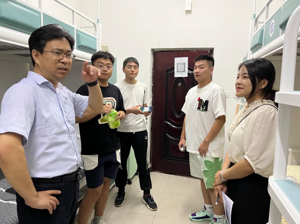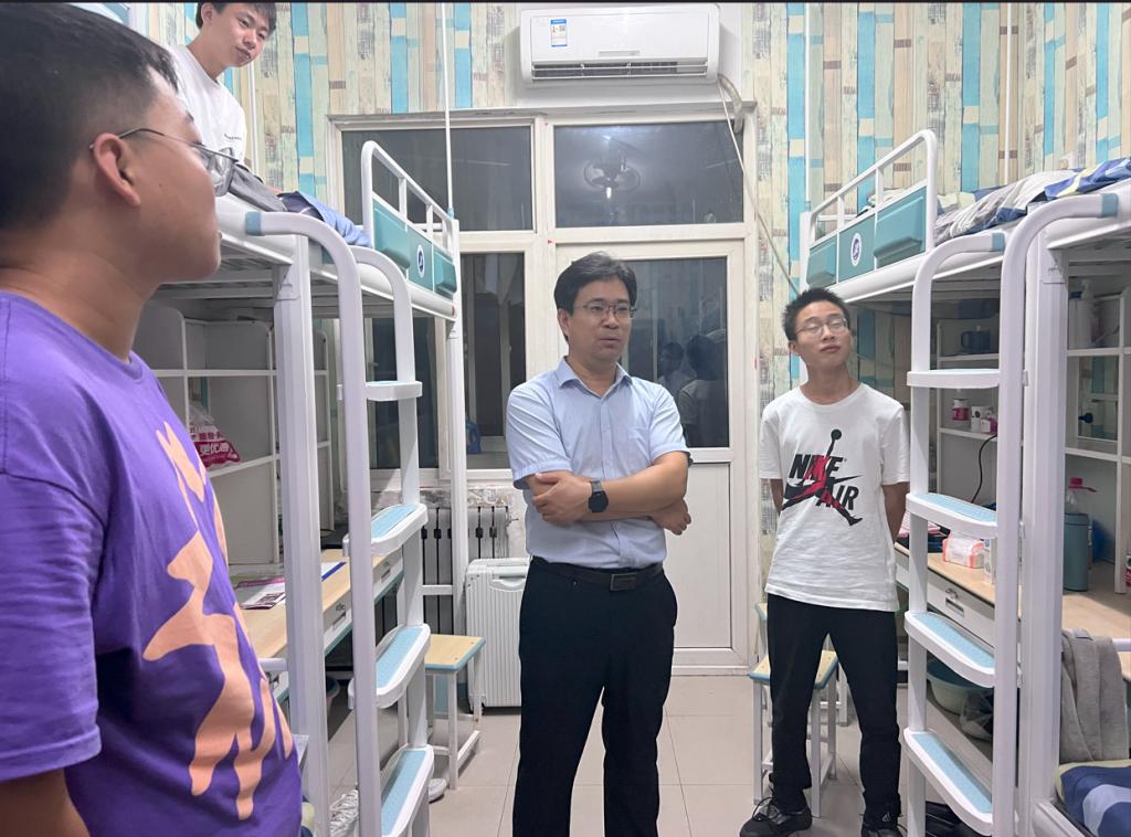 9月6日,在新生入校报到当晚,学院党委书记宋海洋、学生工作办公室主任马武军、2023级辅导员卢筱佳深入新生宿舍,详细了解新生的住宿和生活情况。在走访过程中,宋海洋与新生进行亲切交谈,从住宿饮食、生活习惯、发展规划等多方面深入了解学生情况,询问同学们的报到流程是否顺利,关心同学们的入住体验,并进行现场沟通解决,帮助同学们尽快适应新生活。宋海洋叮嘱新生与同学之间要相互关心,相互帮助,尽快调整好状态、适应大学新环境,以良好的状态迎接大学生活。