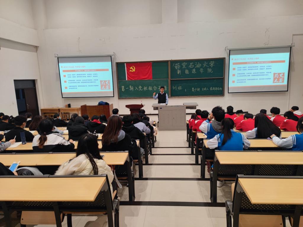 1118日晚,培训班第十讲“坚定信念—争做矢志报国的新时代‘绿能’先锋”在邑校区天工楼115室举行,学院党委书记宋海洋担任主讲。宋海洋从赓续红色血脉、传承奋斗精神,百年大党的青年担当,新时代青年的新使命,搭建青年创新平台、助力青年成长成才等四个方面,引导同学们要清醒地认识到不论过去、现在还是未来,中国青年始终是实现中华民族伟大复兴的先锋力量,作为青年人要始终与祖国共奋进,坚定跟党走。最后,宋海洋从学校的石油精神,党的革命精神,青年学子的担当等方面为同学们进行深入浅出的讲解,他叮嘱同学们要时刻秉承西石大的精神基因,勇做具有宽广格局、全球视野、创新思维和创新能力的新时代负重前行的开拓者。