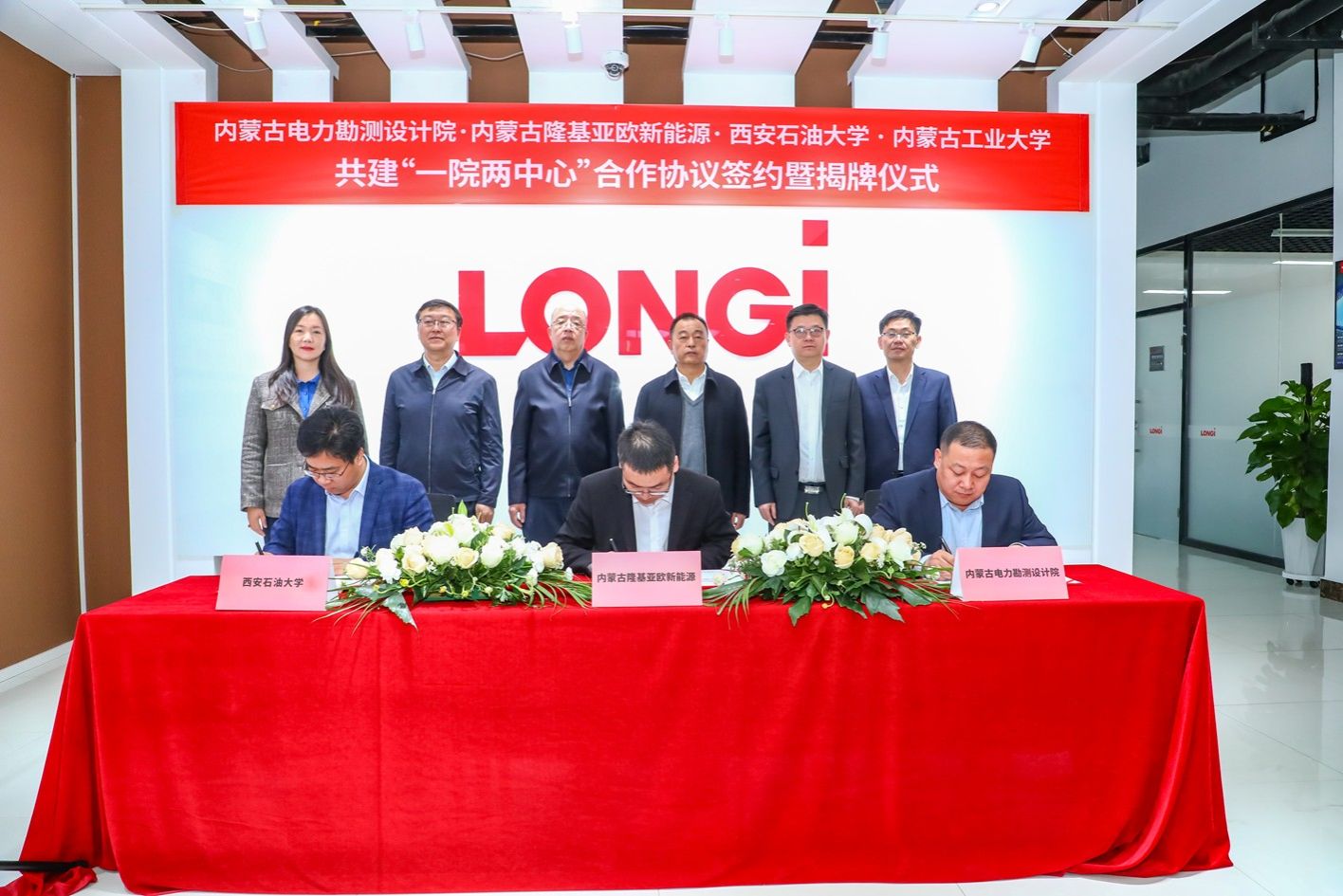 院长宋海洋与内蒙古隆基亚欧总部产品解决方案高级经理王海法、内蒙院副总经理、总工程师严志勇,在与会人员的共同见证下,签署了《一院两中心合作协议》。程永清携手胡大双、立民及内蒙古自治区工业和信息化厅科电处处长彭武华,共同为“一院两中心”揭牌。