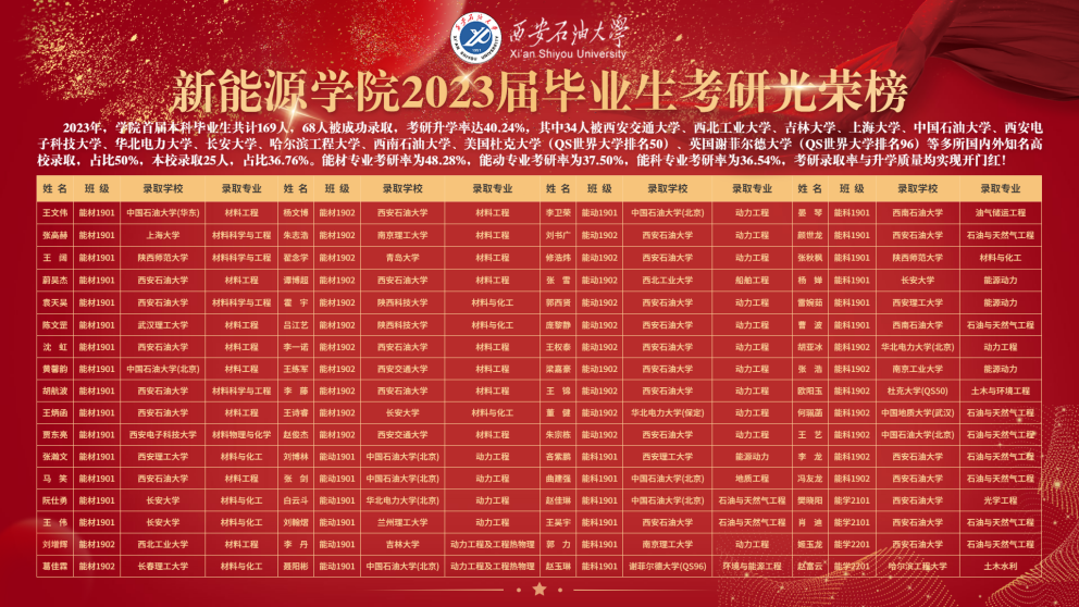 截止23年5月,杏吧论坛 2019级毕业生毕业去向落实率为81%,其中考研录取率为40.24%(新能源材料与器件专业考研录取率为48.28%,能源与动力工程专业考研录取率为37.50%,新能源科学与工程专业考研录取率为36.54%,)。已就业的67人中多人被隆基绿能科技股份有限公司、三星中国半导体、国家管网集团西部管道有限责任公司、胜利油田、长庆油田等知名企业签约;学院首届本科毕业生共计169人,68人被成功录取,考研升学率达40.24%,其中34人被西安交通大学、西北工业大学、吉林大学、上海大学、中国石油大学、西安电子科技大学、华北电力大学、长安大学、哈尔滨工程大学、西南石油大学、美国杜克大学(QS世界大学排名50)、英国谢菲尔德大学(QS世界大学排名96)等多所国内外知名高校录取,占比50%,本校录取25人,占比36.76%。